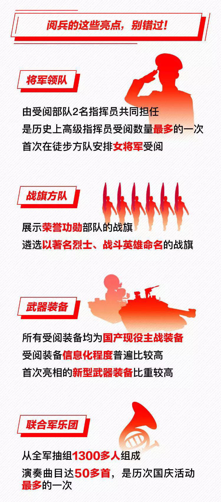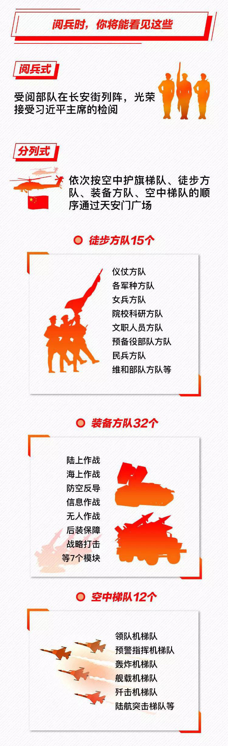 為慶祝新中國成立70周年,10月1日北京天安門廣場(chǎng)將舉行盛大閱兵式。屆時(shí),32個(gè)裝備方隊(duì)、12個(gè)空中梯隊(duì)將通過天安門廣場(chǎng),接受檢閱。此次閱兵,所有受閱裝備均為國產(chǎn)現(xiàn)役主戰(zhàn)裝備,其中包括我軍部分新型裝備,是近幾次閱兵中規(guī)模最大的一次。 強(qiáng)國必須強(qiáng)軍,強(qiáng)軍必須利器。作為我軍機(jī)械化、信息化、智能化裝備發(fā)展的骨干,全軍毀傷打擊的核心支撐和現(xiàn)代化新型陸軍體系作戰(zhàn)能力科研制造的主體,此次國慶閱兵式,兵器工業(yè)集團(tuán)研制生產(chǎn)的16型裝備將接受黨和人民的檢閱,分布在受閱裝備方隊(duì)7個(gè)模塊中的陸上作戰(zhàn)、防空反導(dǎo)、信息作戰(zhàn)、無人作戰(zhàn)、后裝保障五個(gè)模塊、32個(gè)方隊(duì)中的12個(gè)方隊(duì),集中展示了兵器工業(yè)集團(tuán)履行強(qiáng)軍首責(zé)、自主創(chuàng)新的最新成果。 10月1日大閱兵 我們準(zhǔn)備好了 |