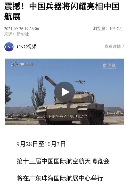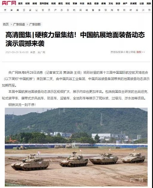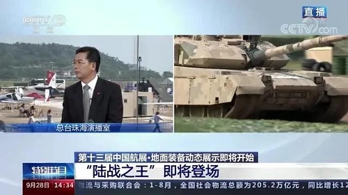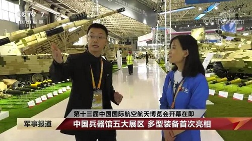 9月28日-10月3日,第十三屆中國(guó)國(guó)際航空航天博覽會(huì)在廣東珠海舉行,中國(guó)兵器工業(yè)集團(tuán)有限公司作為主辦單位閃耀亮相,推出裝甲突擊、火力打擊、智能彈藥、防空反導(dǎo)、無(wú)人裝備、非傳統(tǒng)安全、軍工軍技合作等領(lǐng)域新產(chǎn)品及成體系成建制武器系統(tǒng)和解決方案,全方位展示我國(guó)陸軍外貿(mào)武器裝備的最高水平以及雄厚的科技創(chuàng)新、自主研發(fā)與先進(jìn)制造能力,受到廣泛關(guān)注。 央視《新聞聯(lián)播》報(bào)道第十三屆中國(guó)航展,著重介紹了VT4主戰(zhàn)坦克,關(guān)注航展公眾日中國(guó)兵器館情況。9月28日下午央視《新聞直播間》航展特別節(jié)目《藍(lán)天盛會(huì)》邀請(qǐng)集團(tuán)公司訪(fǎng)談嘉賓做客直播間對(duì)中國(guó)兵器館兵器工業(yè)集團(tuán)展區(qū)等進(jìn)行1小時(shí)直播;9月28日下午、10月2日下午分別對(duì)地面裝備動(dòng)態(tài)表演進(jìn)行兩場(chǎng)直播。央視《朝聞天下》、《新聞直播間》、《共同關(guān)注》、《天下財(cái)經(jīng)》、《軍事報(bào)道》、《正午國(guó)防軍事》、《軍武零距離》等相繼推出集團(tuán)公司參展裝備的報(bào)道。