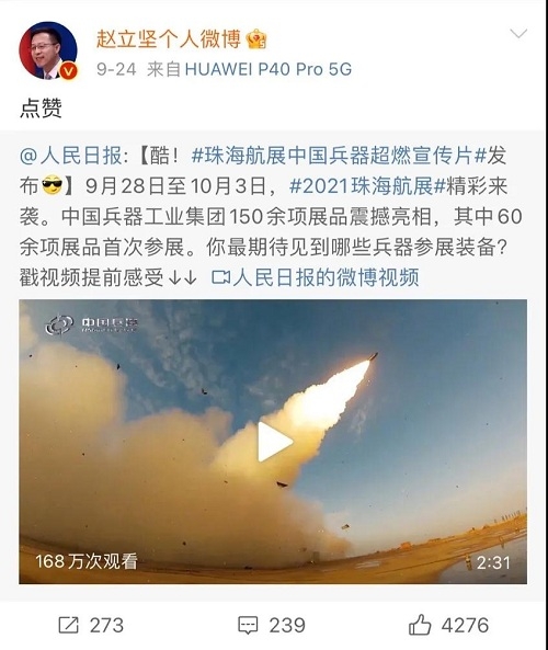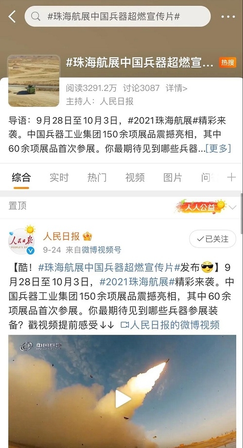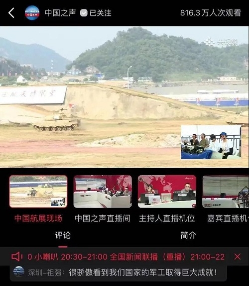 人民日?qǐng)?bào)、新華社、中國(guó)日?qǐng)?bào)、共青團(tuán)中央、國(guó)資小新、騰訊軍事、鳳凰軍事、新浪軍事等新媒體發(fā)布的集團(tuán)公司航展宣傳片等視頻作品燃爆全網(wǎng),閱讀量突破三千萬(wàn)人次,得到外交部發(fā)言人趙立堅(jiān)轉(zhuǎn)載點(diǎn)贊。集團(tuán)公司微信、微博、抖音號(hào)、微信視頻號(hào)等新媒體宣傳片播放閱讀量超過(guò)400萬(wàn)人次。同時(shí),央視新聞、新華社、中國(guó)之聲、央視軍事、央視新媒體、解放軍報(bào)、共青團(tuán)中央、國(guó)資小新、環(huán)球時(shí)報(bào)等多家媒體對(duì)集團(tuán)公司靜、動(dòng)態(tài)展區(qū)進(jìn)行現(xiàn)場(chǎng)直播,在電視端、客戶(hù)端、微信視頻號(hào)、微博、B站、快手、抖音等平臺(tái)受到高度關(guān)注。著名軍事專(zhuān)家杜文龍、央視主持人顧國(guó)寧、央廣中國(guó)之聲主持人王藝等直播兵器館、動(dòng)態(tài)表演區(qū)裝備。