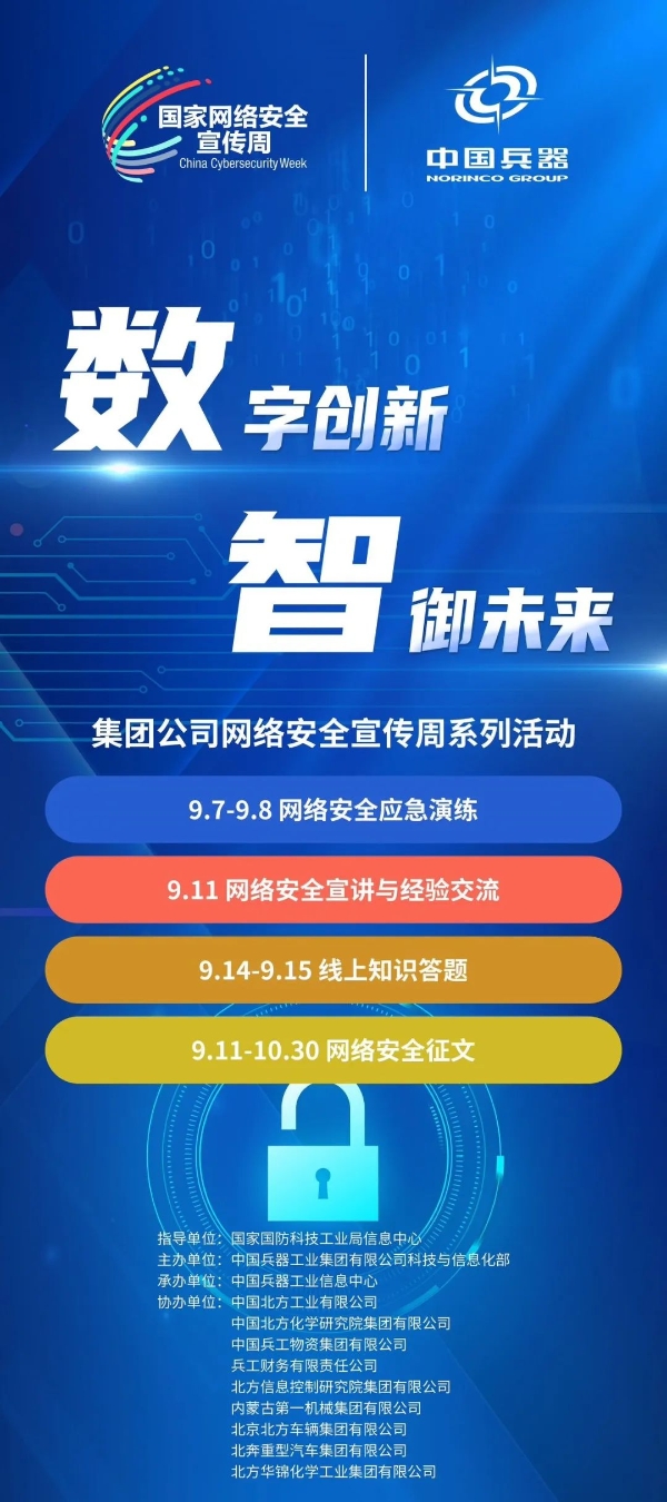 9月11日至17日,中國(guó)兵器工業(yè)集團(tuán)有限公司以“數(shù)字創(chuàng)新 智御未來(lái)”為主題,圍繞集團(tuán)公司“1+5”戰(zhàn)略和“雙十”規(guī)劃,組織開(kāi)展集團(tuán)公司網(wǎng)絡(luò)安全宣傳周系列活動(dòng)。 9月11日,集團(tuán)公司科技與信息化部組織在京單位召開(kāi)網(wǎng)絡(luò)安全宣講與經(jīng)驗(yàn)交流活動(dòng),邀請(qǐng)公安部第一研究所網(wǎng)絡(luò)安全專家針對(duì)網(wǎng)絡(luò)安全形勢(shì)和個(gè)人防護(hù)技能以及網(wǎng)絡(luò)安全等級(jí)保護(hù)主要工作環(huán)節(jié)和標(biāo)準(zhǔn)應(yīng)用作專題講座,會(huì)上北方公司、物資集團(tuán)、財(cái)務(wù)公司、北方車輛集團(tuán)、北奔重汽進(jìn)行了工作經(jīng)驗(yàn)分享。