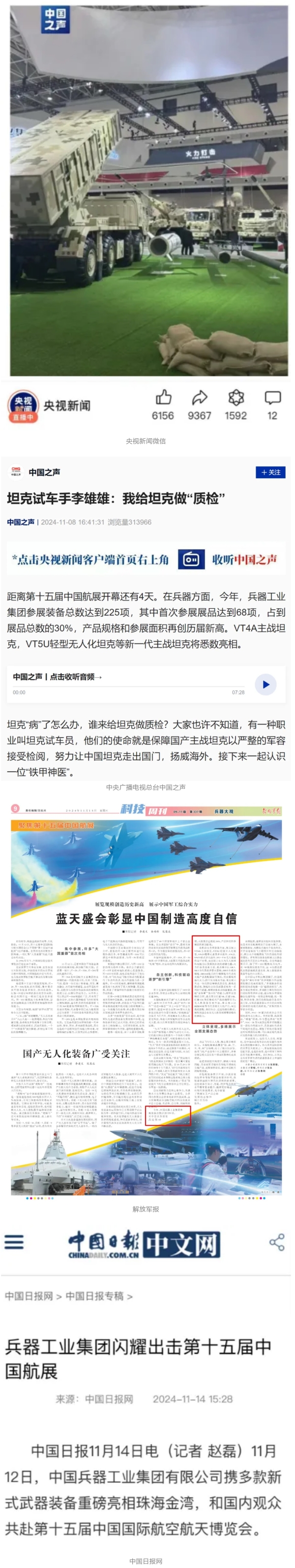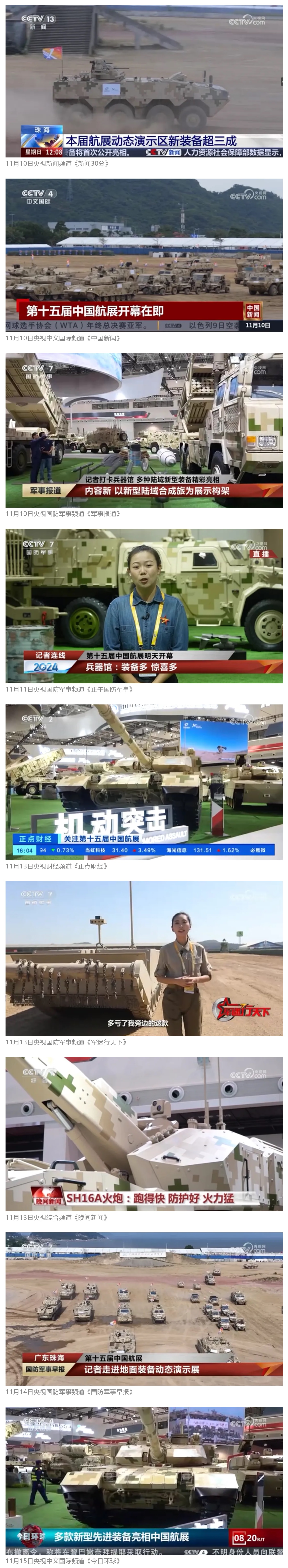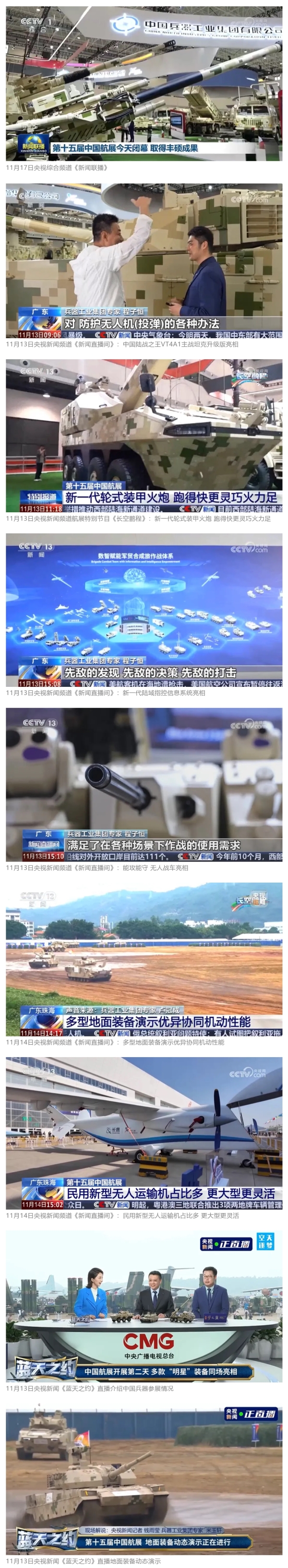 11月13日央視新聞《藍(lán)天之約》直播地面裝備動態(tài)演示此次航展,央視綜合頻道《新聞聯(lián)播》《晚間新聞》、新聞?lì)l道《新聞直播間》《新聞30分》《朝聞天下》《共同關(guān)注》《東方時(shí)空》《午夜新聞》、財(cái)經(jīng)頻道《天下財(cái)經(jīng)》《經(jīng)濟(jì)信息聯(lián)播》《正點(diǎn)財(cái)經(jīng)》《第一時(shí)間》、中文國際頻道《今日環(huán)球》《中國新聞》、國防軍事頻道《軍事報(bào)道》《正午國防軍事》《國防軍事早報(bào)》《軍迷行天下》等欄目共播出兵器工業(yè)集團(tuán)參展相關(guān)新聞報(bào)道40余條。11月10日央視新聞?lì)l道《新聞30分》11月10日央視中文國際頻道《中國新聞》11月10日央視國防軍事頻道《軍事報(bào)道》11月11日央視國防軍事頻道《正午國防軍事》