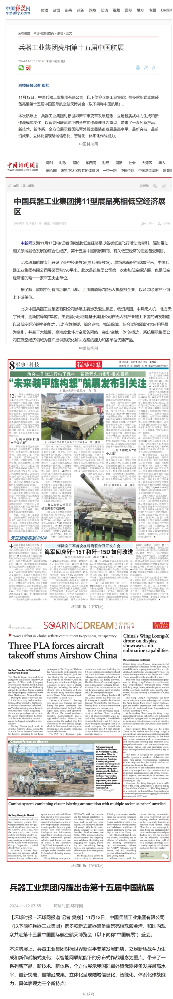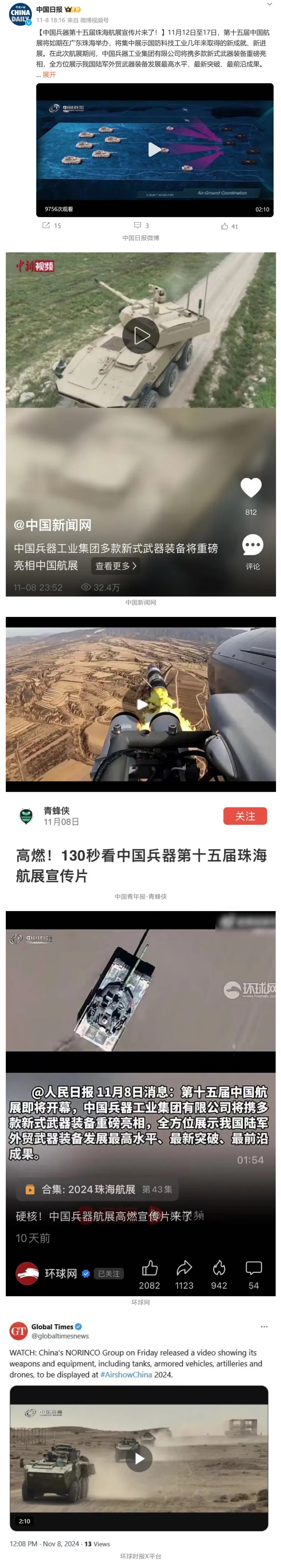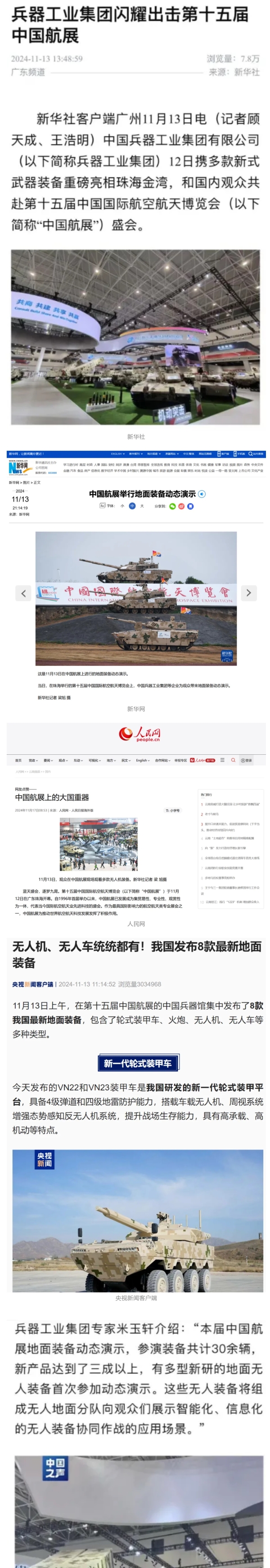 11月13日央視新聞《藍(lán)天之約》直播地面裝備動態(tài)演示此次航展,央視綜合頻道《新聞聯(lián)播》《晚間新聞》、新聞?lì)l道《新聞直播間》《新聞30分》《朝聞天下》《共同關(guān)注》《東方時(shí)空》《午夜新聞》、財(cái)經(jīng)頻道《天下財(cái)經(jīng)》《經(jīng)濟(jì)信息聯(lián)播》《正點(diǎn)財(cái)經(jīng)》《第一時(shí)間》、中文國際頻道《今日環(huán)球》《中國新聞》、國防軍事頻道《軍事報(bào)道》《正午國防軍事》《國防軍事早報(bào)》《軍迷行天下》等欄目共播出兵器工業(yè)集團(tuán)參展相關(guān)新聞報(bào)道40余條。11月10日央視新聞?lì)l道《新聞30分》11月10日央視中文國際頻道《中國新聞》11月10日央視國防軍事頻道《軍事報(bào)道》11月11日央視國防軍事頻道《正午國防軍事》