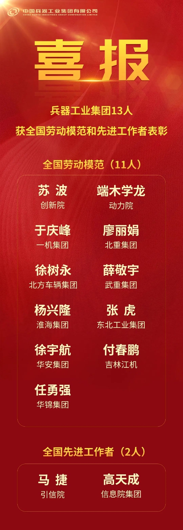 兵器工業(yè)集團(tuán)13人獲全國(guó)勞動(dòng)模范和先進(jìn)工作者表彰 |