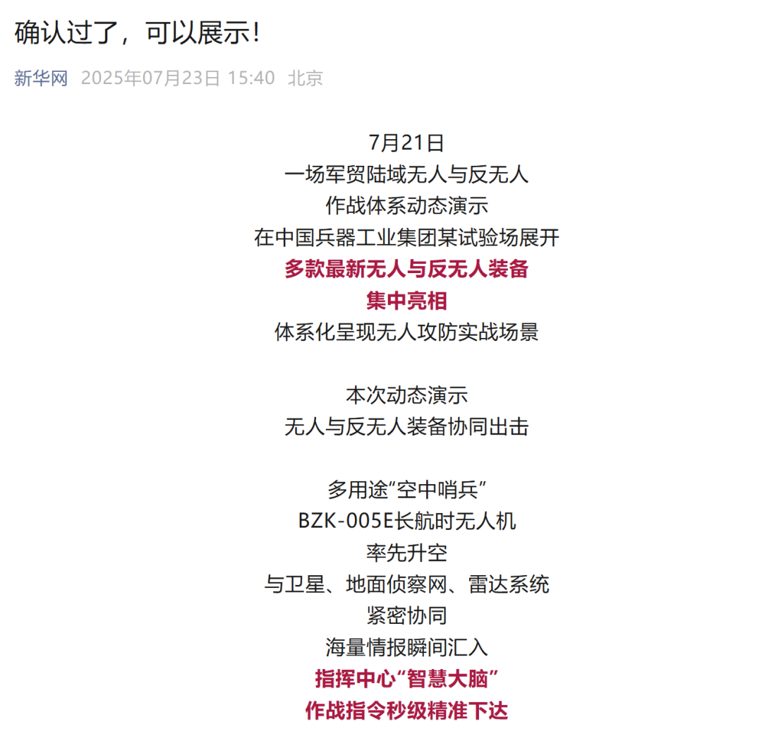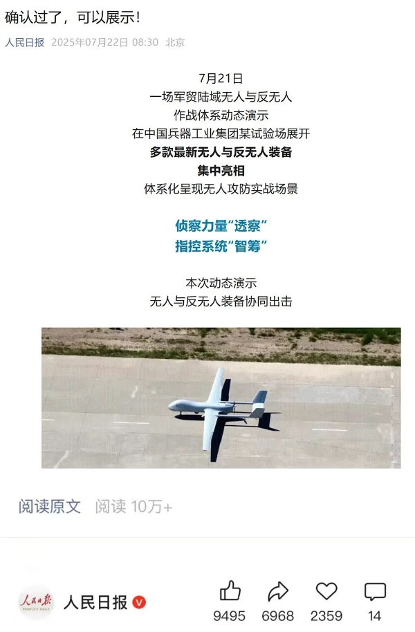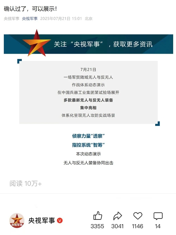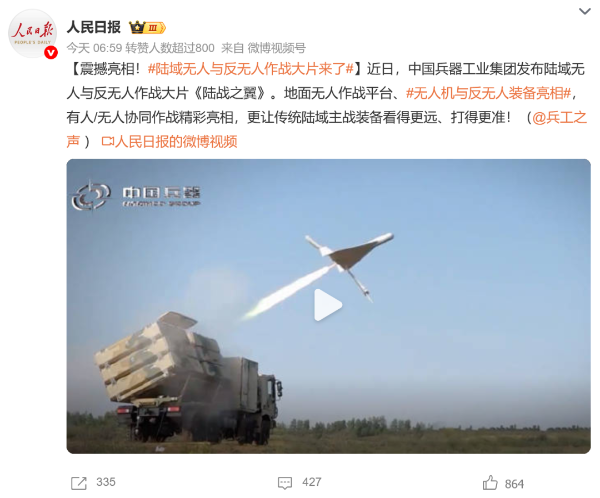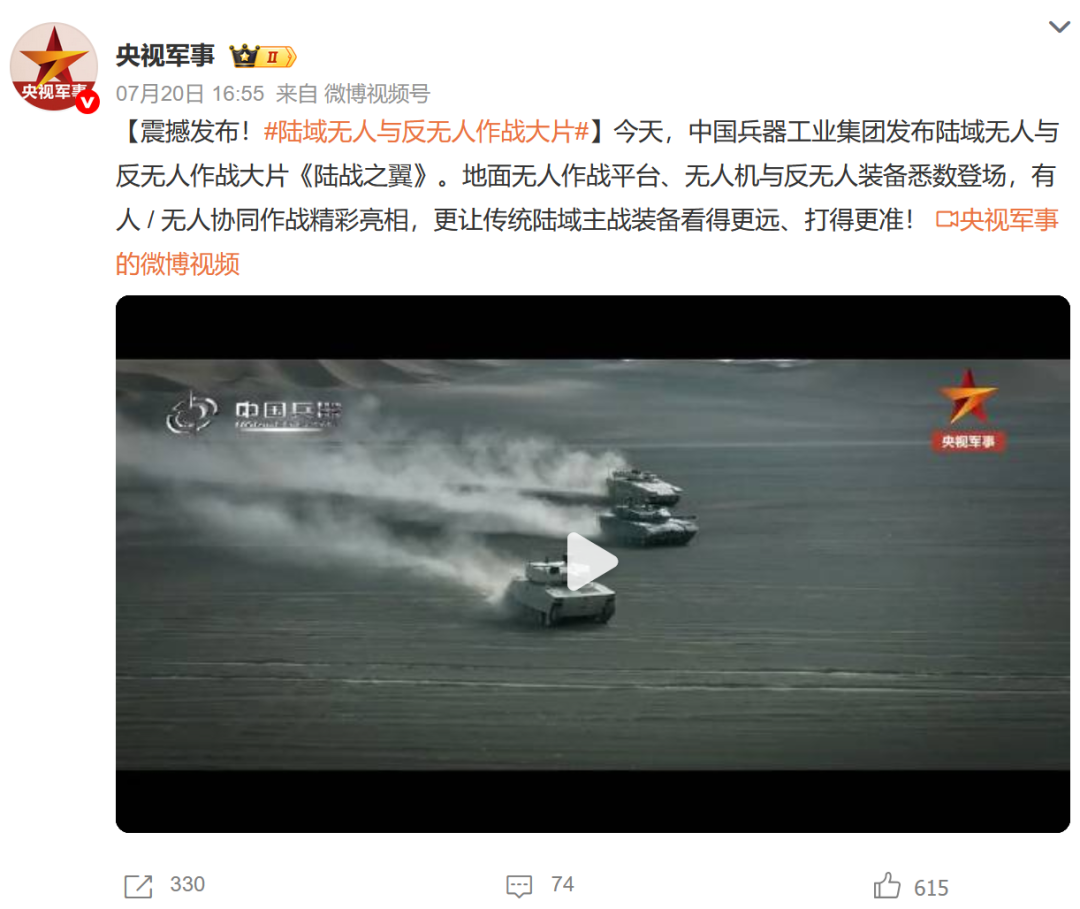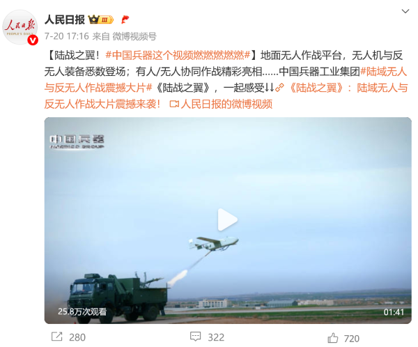 7月21日,中國兵器工業(yè)集團有限公司在位于內(nèi)蒙古的某試驗場舉辦軍貿(mào)陸域無人與反無人作戰(zhàn)體系主題日活動,攜無人機、巡飛彈、反無人機等最新武器裝備登場亮相,展現(xiàn)了一場無人與反無人領域激烈對抗的實戰(zhàn)場景。中央主流媒體、地方媒體、知名網(wǎng)絡媒體,以及集團公司各宣傳平臺紛紛進行報道,多次登上熱搜,引發(fā)廣泛關注。 央視新聞頻道《新聞直播間》《東方時空》《24小時》、國防軍事頻道《正午國防軍事》《軍事報道》《國防軍事早報》、中文國際頻道《今日環(huán)球》、央視軍事新媒體等報道了集團公司軍貿(mào)陸域無人與反無人作戰(zhàn)體系首次公開實裝動態(tài)演示有關情況,重點介紹了無人與反無人作戰(zhàn)最新裝備。 央視新聞頻道《新聞直播間》:內(nèi)蒙古 軍貿(mào)陸域無人與反無人作戰(zhàn)最新裝備亮相 央視新聞頻道《新聞直播間》:內(nèi)蒙古 軍貿(mào)陸域無人與反無人作戰(zhàn)最新裝備亮相 記者探訪無人裝備展區(qū) 央視新聞頻道《新聞直播間》:軍貿(mào)陸域無人與反無人作戰(zhàn)最新裝備亮相·記者探訪 最強“盾牌” 反無人機系統(tǒng)新升級 人民日報微博、央視軍事微博、央視新聞客戶端、中國新聞網(wǎng)、中新社國是直通車抖音、環(huán)球網(wǎng)微博、環(huán)球時報(X平臺、英文版客戶端)、中國日報網(wǎng)、央視軍事報道微博、中國軍號微博、中央廣播電視總臺“空天逐夢”微信視頻號、共青團中央B站、國資小新微博等中央主流媒體、國家部委的新媒體播發(fā)集團公司陸域無人與反無人作戰(zhàn)大片等視頻作品。 人民日報微博 央視軍事微博 人民日報、新華網(wǎng)、央視軍事、央視新聞、中央廣播電視總臺中國之聲、中國新聞網(wǎng)、中國日報網(wǎng)、中國日報英文報刊《CHINA DAILY》、《科技日報》、光明日報客戶端、環(huán)球網(wǎng)、環(huán)球時報、人民日報海外版-海外網(wǎng)、央視網(wǎng)、小央視頻、參考消息、瞭望東方周刊、共青團中央、國資小新新媒體、新浪網(wǎng)、騰訊網(wǎng)、搜狐網(wǎng)、鳳凰網(wǎng)、網(wǎng)易網(wǎng)等中央主流媒體、國家部委的新媒體及知名網(wǎng)絡媒體對集團公司軍貿(mào)陸域無人與反無人作戰(zhàn)體系主題日活動進行了圖文、音頻、視頻報道。 央視軍事微信 人民日報微信 新華網(wǎng)微信 來源/各主流媒體 |